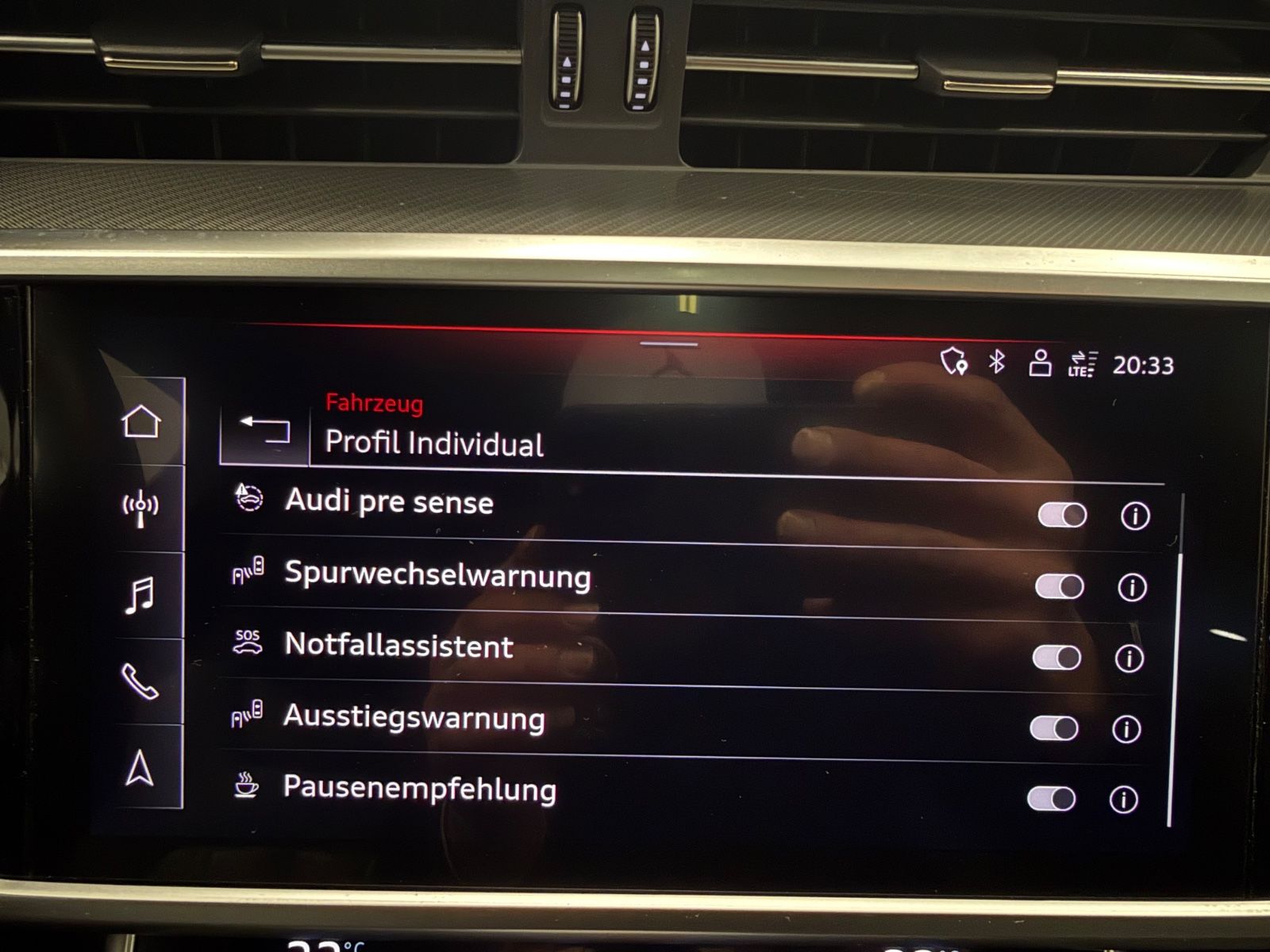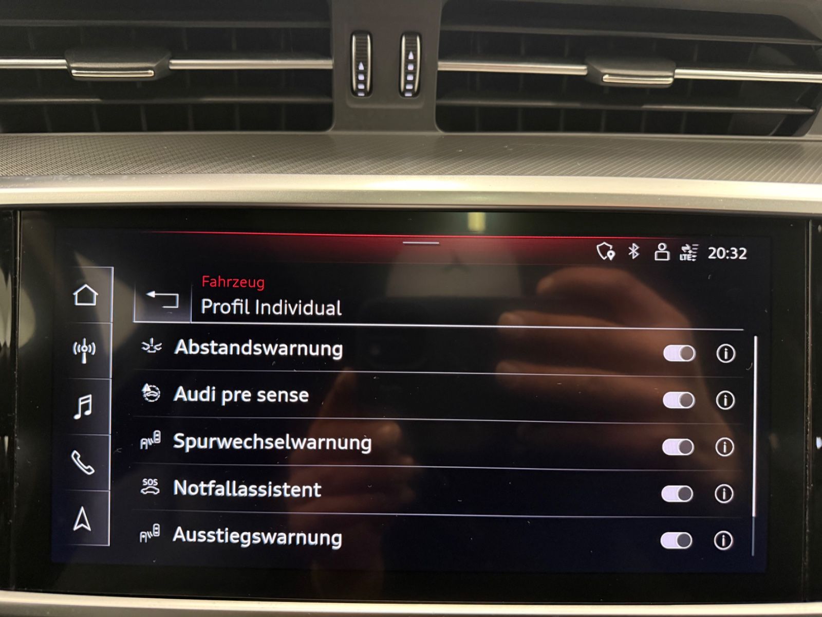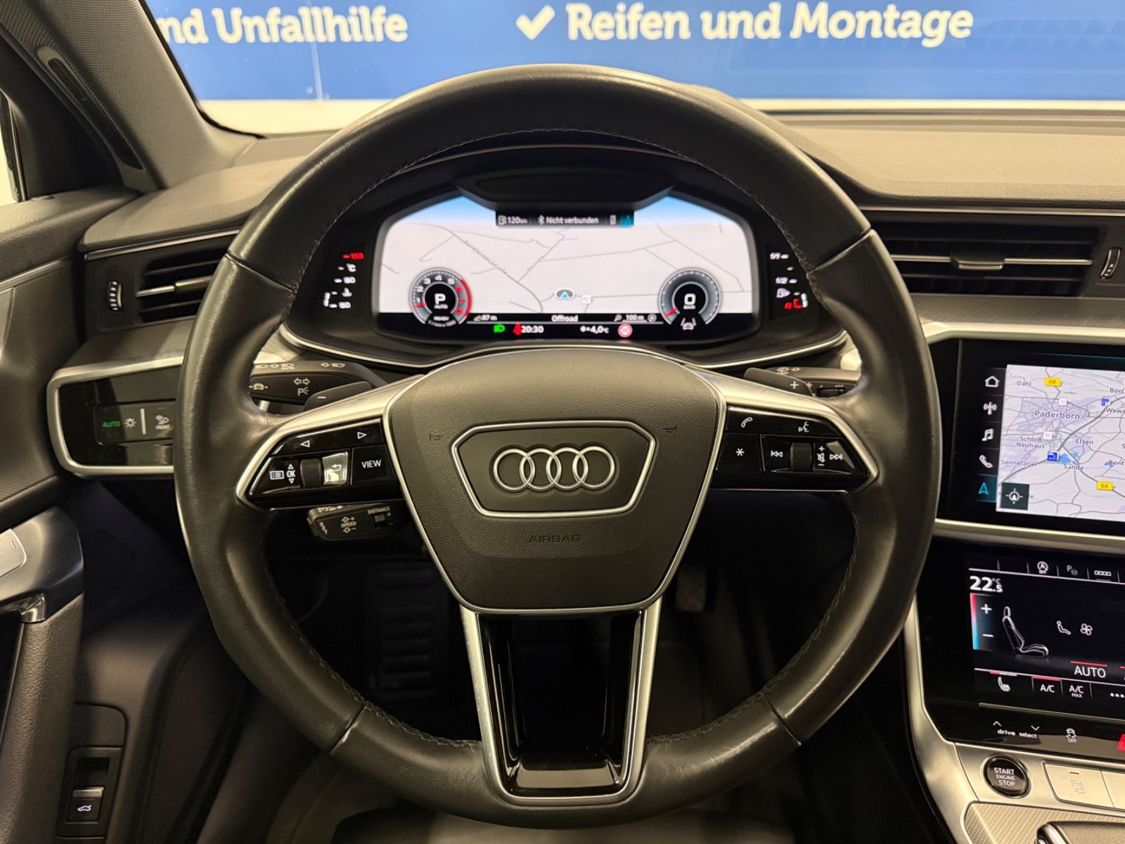 Ablage-Paket Ambiente-Beleuchtung Anhängerkupplung Vorbereitung Audi Smartphone Interface Bedienelemente Glasoptik, inkl. erweiterter Aluminium-Optik Business-Paket Dachhimmel Stoff, schwarz Fahrassistenz-System: Spurwechselassistent (Side Assist) inkl. Audi pre sense rear Fondsitzanlage (3 Sitzplätze) Gepäckraumklappe elektr. betätigt (öffnen + schliessen) Kombiinstrument digital (virtual cockpit plus) Komfortschlüssel mit sensorgesteuerter Heckklappenentriegelung inkl. (öffnen + schliessen) LM-Felgen 8,5x20 (5-V-Speichen-Design, kontrastgrau / graphitgrau, teilpoliert) Metallic-Lackierung Optik-Paket schwarz Panorama-Ausstelldach elektrisch Rückfahrkamera Seitenairbag vorn und hinten Sitzbezug / Polsterung: Leder Valcona Sitze vorn elektr. verstellbar (links mit Memory) Sound-System DSP / Audi Sound-System