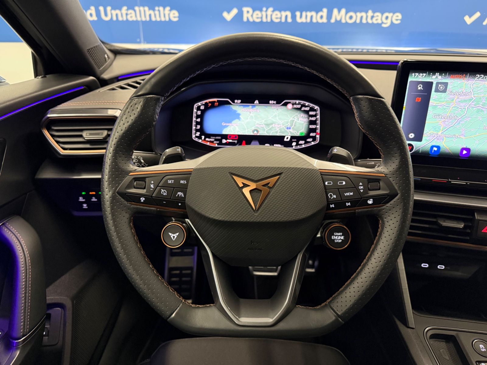 Airbag Beifahrerseite abschaltbar Airbag Fahrer-/Beifahrerseite Ambiente-Beleuchtung Smart Ambient Light Antriebs-Schlupfregelung (ASR) Audio-Navigationssystem mit Touchscreen Farbbildschirm Außenspiegel elektr. verstell-, heiz- und anklappbar mit Spiegelabsenkung und Welcome Light Blinkleuchten LED in Außenspiegel integriert Bluetooth-Schnittstelle mit Freisprecheinrichtung integriert Dachhimmel schwarz Dachreling schwarz, hochglänzend Differentialsperre (Vorderachse) Doppeltonhorn Einstiegsleisten (Aluminium) vorn, beleuchtet Fahrassistenz-Paket: Stau- und Notfallassistent Fahrassistenz-Paket: Travel Assist Fahrassistenz-System: Adaptive Fahrwerksregelung (DCC) Fahrassistenz-System: Fahrprofilauswahl (CUPRA Drive Profile) Fahrassistenz-System: Parklenkassistent mit Einparkhilfe vorn und hinten Fensterheber elektrisch vorn + hinten mit Komfortschaltung Fensterzierleisten schwarz hochglänzend Gepäckraumabdeckung / Rollo Heckleuchten Voll-LED mit dynamischem Lichtband (Infinite Light) Isofix-Aufnahmen für Kindersitz an Rücksitz Karosserie: 5-türig Klimaanlage Climatronic 3-Zonen Kombiinstrument digital (virtual cockpit) Kopf-Airbag-System Laderaumboden variabel und herausnehmbar Lendenwirbelstütze Sitz vorn links, verstellbar Lendenwirbelstütze Sitz vorn rechts, verstellbar Licht- und Sicht-Paket LM-Felgen Mittelarmlehne hinten Mittelkonsole vorn mit Mittelarmlehne Becherhalter Ablagebox und Luftausströmer hinten Motor 2,0 Ltr. - 180 kW TSI Notrufsystem Otto-Partikelfilter (OPF) Parkbremse elektrisch Radioempfang digital (DAB+) Radstand 2679 mm Reserverad als Notrad Rückfahrkamera Rücksitzlehne geteilt/klappbar (1/3-2/3) Rücksitzlehnen umklappbar mit Fernentriegelung im Kofferraum Schadstoffarm nach Abgasnorm Euro 6d Seitenairbag Seitenairbag vorn mitte (Central Airbag) Seitenscheiben hinten und Heckscheibe abgedunkelt Sitz vorn links höhenverstellbar Sitz vorn rechts höhenverstellbar Sitzbezug / Polsterung: Stoff Sonnenblende links mit Spiegel (beleuchtet) Sonnenblende rechts mit Spiegel (beleuchtet) Sport-Schalensitze vorn mit integrierten Kopfstützen Start/Stop-Anlage Steckdose (12V-Anschluß) vorn Steckdose 230V im Gepäckraum USB-Ladeanschlüsse (2-fach, Typ C) für 2.Sitzreihe USB-Schnittstelle vorn (2-fach, Typ C) Verzurrösen Koffer-/Laderaum Warnanlage für Sicherheitsgurt-System Wärmeschutzverglasung Leichtmetallräder Nebelscheinwerfer Seitenscheiben hinten und Heckscheibe abgedunkelt
