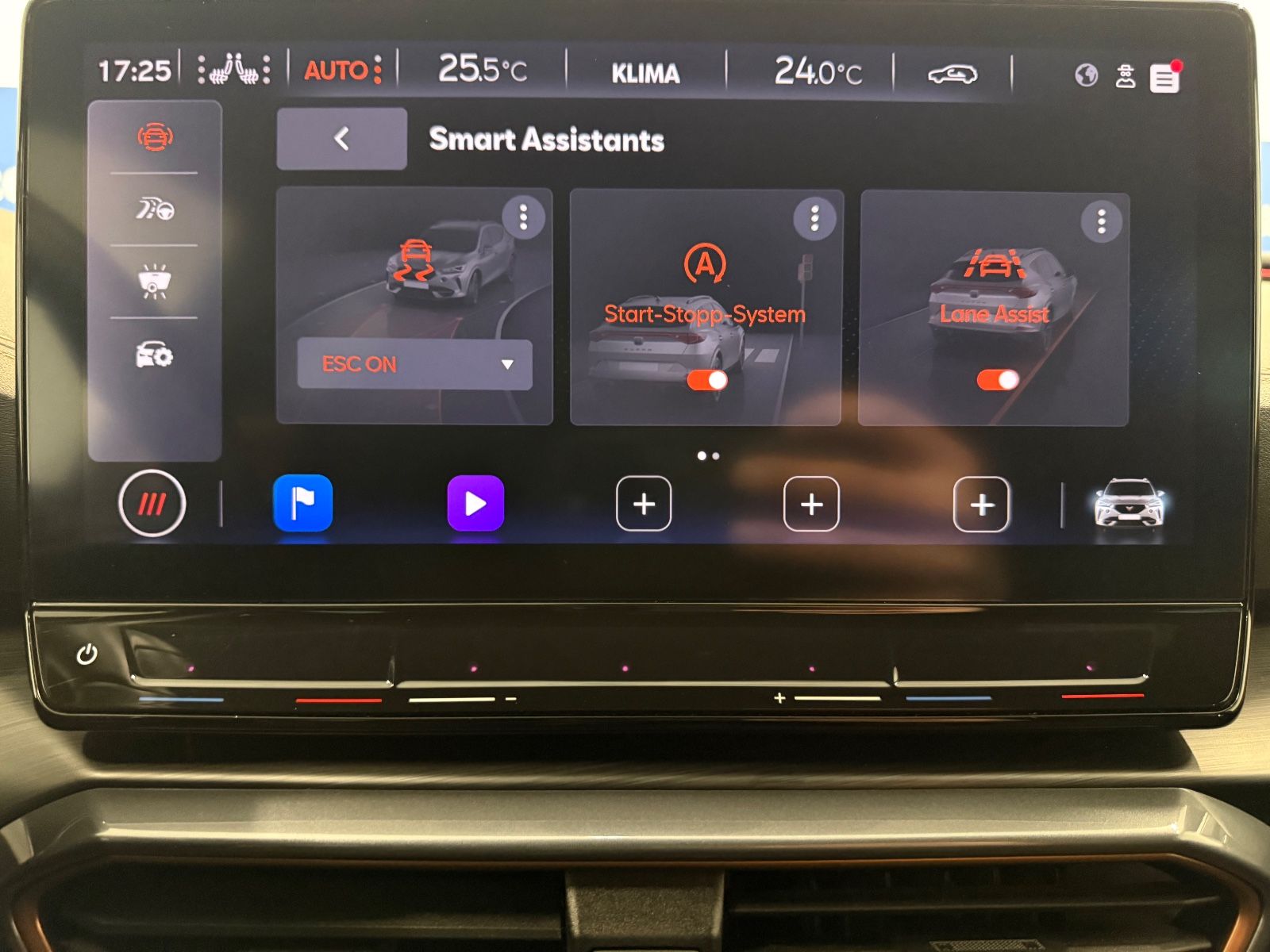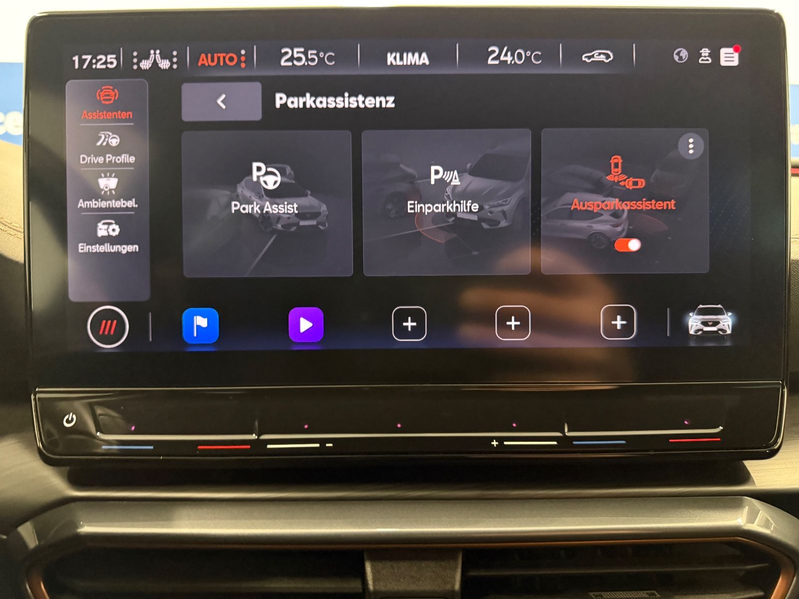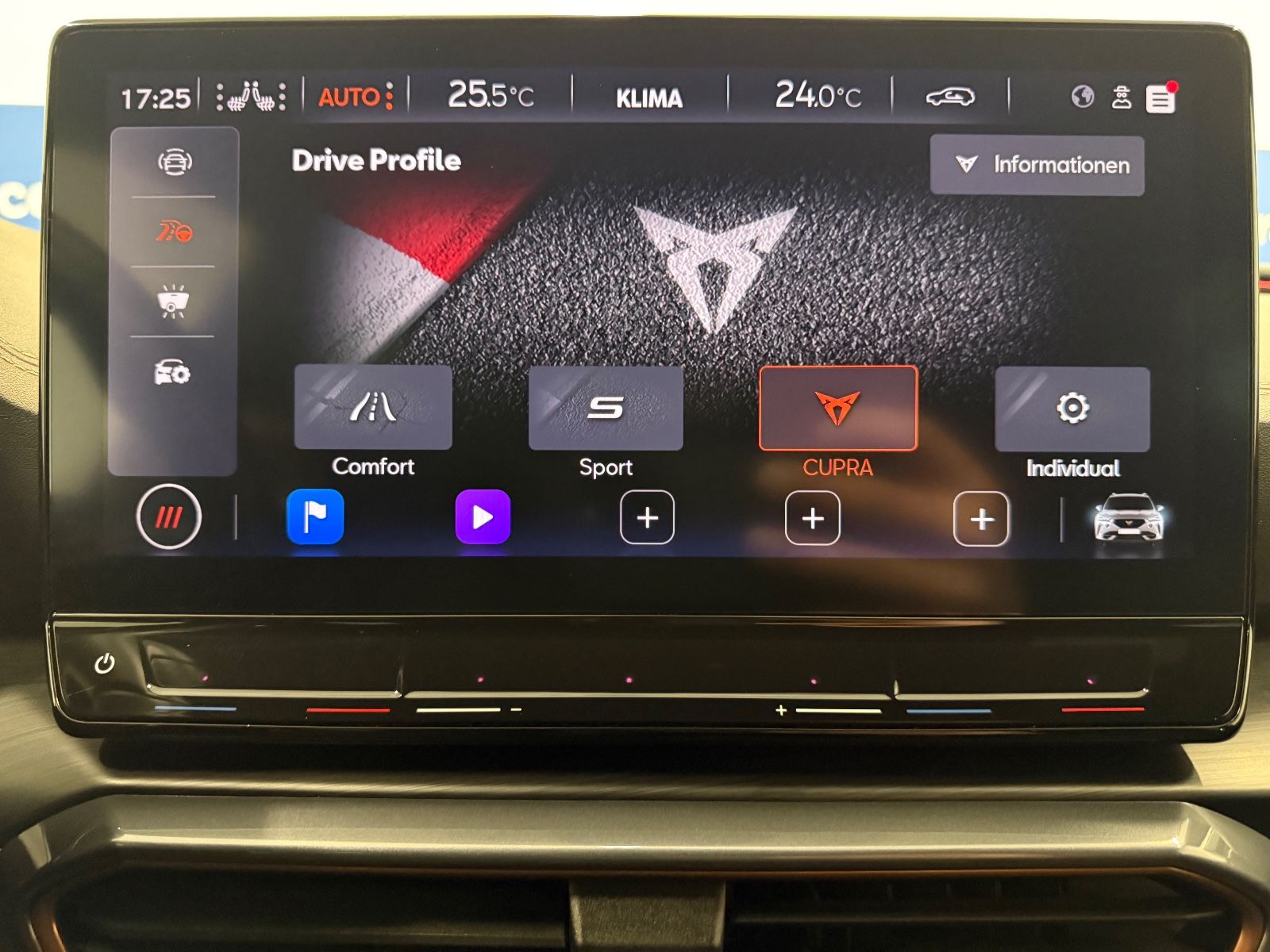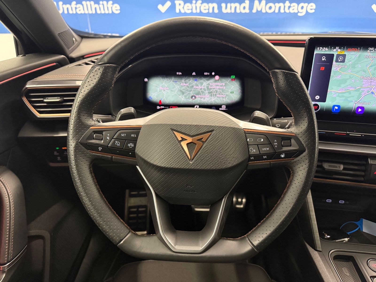 Airbag Beifahrerseite abschaltbar Airbag Fahrer-/Beifahrerseite Ambiente-Beleuchtung Smart Ambient Light Antriebs-Schlupfregelung (ASR) Audio-Navigationssystem mit Touchscreen Farbbildschirm Außenspiegel elektr. verstell-, heiz- und anklappbar mit Spiegelabsenkung und Welcome Light Blinkleuchten LED in Außenspiegel integriert Bluetooth-Schnittstelle mit Freisprecheinrichtung integriert Dachhimmel schwarz Dachreling schwarz, hochglänzend Differentialsperre (Vorderachse) Doppeltonhorn Einstiegsleisten (Aluminium) vorn, beleuchtet Fahrassistenz-Paket L Fahrassistenz-Paket: Stau- und Notfallassistent Fahrassistenz-Paket: Travel Assist Fahrassistenz-System: Adaptive Fahrwerksregelung (DCC) Fahrassistenz-System: Fahrprofilauswahl (CUPRA Drive Profile) Fahrassistenz-System: Parklenkassistent mit Einparkhilfe vorn und hinten Fensterheber elektrisch vorn + hinten mit Komfortschaltung Fensterzierleisten schwarz hochglänzend Gepäckraumabdeckung / Rollo Heckleuchten Voll-LED mit dynamischem Lichtband (Infinite Light) Isofix-Aufnahmen für Kindersitz an Rücksitz Karosserie: 5-türig Klimaanlage Climatronic 3-Zonen Kombiinstrument digital (virtual cockpit) Kopf-Airbag-System Laderaumboden variabel und herausnehmbar Lendenwirbelstütze Sitz vorn links, verstellbar Lendenwirbelstütze Sitz vorn rechts, verstellbar Licht- und Sicht-Paket Mittelarmlehne hinten Mittelkonsole vorn mit Mittelarmlehne Becherhalter Ablagebox und Luftausströmer hinten Motor 2,0 Ltr. - 180 kW TSI Notrufsystem Otto-Partikelfilter (OPF) Parkbremse elektrisch Radioempfang digital (DAB+) Rückfahrkamera Rücksitzlehne geteilt/klappbar (1/3-2/3) Rücksitzlehnen umklappbar mit Fernentriegelung im Kofferraum Schadstoffarm nach Abgasnorm Euro 6d Seitenairbag Seitenairbag vorn mitte (Central Airbag) Seitenscheiben hinten und Heckscheibe abgedunkelt Sitz vorn links höhenverstellbar Sitz vorn rechts höhenverstellbar Sitzbezug / Polsterung: Stoff Sonnenblende links mit Spiegel (beleuchtet) Sonnenblende rechts mit Spiegel (beleuchtet) Sport-Schalensitze vorn mit integrierten Kopfstützen Start/Stop-Anlage Steckdose (12V-Anschluß) vorn Steckdose 230V im Gepäckraum USB-Ladeanschlüsse (2-fach, Typ C) für 2.Sitzreihe USB-Schnittstelle vorn (2-fach, Typ C) Verzurrösen Koffer-/Laderaum Warnanlage für Sicherheitsgurt-System Wärmeschutzverglasung Alle Angaben ohne Gewähr