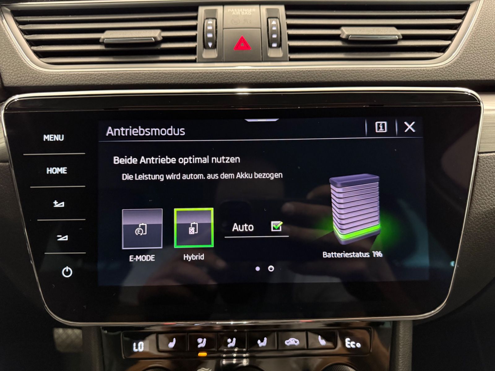 Ablagefach für Regenschirm Airbag Beifahrerseite abschaltbar Airbag Fahrer-/Beifahrerseite Akustischer Fußgängerschutz Außensound (e-sound) Antriebs-Schlupfregelung (ASR) Ausstattungs-Paket: Green tec Außenspiegel elektr. verstell-, heiz- und anklappbar, mit Abblendautomatik Außenspiegel mit Umfeldleuchte Außenspiegel Wagenfarbe Bremsassistent Bremsenergierückgewinnung Brillenfach Chromzierleisten an Seitenfenstern Dachreling eloxiert Durchladeeinrichtung (Mittelarmlehne hinten) Elektromotor 85 kW (Hybridantrieb) Elektron. Querdifferentialsperre (XDS) Fahrassistenz-System: Adaptive Fahrwerksregelung (DCC) Fahrassistenz-System: Auffahrwarnsystem mit City-Notbremsfunktion (Frontradar-Assistent) Fahrassistenz-System: Berganfahr-Assistent (Hill-Holder) Fahrassistenz-System: Multikollisionsbremse (Multi Collision Brake) Fensterheber elektrisch vorn + hinten Freisprechanlage Telefon mit Bluetooth Handschuhfach beleuchtet Heckleuchten LED (Kristallglas-Optik) Heckscheibenwischer Hybrid 160 kW (Motor 1,4 Ltr. - 115 kW) Infotainment-Paket Amundsen Infotainment-Paket Bolero Innenausstattung: Dekoreinlagen Anthrazit - Brushed Innenausstattung: Dekoreinlagen Grau (Metall-Optik) Innenspiegel mit Abblendautomatik Isofix-Aufnahmen für Kindersitz an Rücksitz Karosserie: 5-türig Knieairbag Fahrerseite Kofferraum / Heckklappe elektrisch betätigt (öffnen + schliessen) Kombiinstrument digital (virtual cockpit) Kopf-Airbag-System Kopfstützen hinten Kopfstützen vorn Lehnenentriegelung der Rücksitzlehne im Kofferraum Lendenwirbelstütze Sitz vorn links Lenkrad (Leder - 2-Speichen) mit Multifunktion Lenksäule (Lenkrad) höhenverstellbar Lenksäule (Lenkrad) längsverstellbar Lichtassistent (Coming Home, Leaving Home) Line-In-Audioanschluss in Mittelkonsole LM-Felgen Modellpflege Motor-Schleppmoment-Regulator (MSR) Nebelscheinwerfer LED Nebelscheinwerfer mit Abbiegelicht Notrufsystem Otto-Partikelfilter (OPF) Radioempfang digital (DAB+) Reifen-Reparaturkit Reifendruck-Kontrollsystem Rücksitzlehne geteilt/klappbar Schadstoffarm nach Abgasnorm Euro 6d Schalt-/Wählhebelgriff Leder Scheibenwaschdüsen heizbar Scheibenwischer Aero (Flachblattscheibenwischer) Scheinwerfer LED mit adaptiver Lichtverteilung (AFS) Seitenairbag vorn Servolenkung elektronisch (Servotronic) Sitz vorn links höhenverstellbar Sitz vorn rechts höhenverstellbar Sitze vorn elektr. verstellbar (links mit Memory) Sitzheizung vorn Sitzlehne vorn rechts klappbar SmartLink (MirrorLink, Apple CarPlay und Android Auto) Sonnenblende links mit Spiegel Sonnenblende rechts mit Spiegel Start/Stop-Anlage Steckdose (12V-Anschluß) im Koffer-/Laderaum Steckdose (12V-Anschluß) in Mittelkonsole vorn Verzurrösen Koffer-/Laderaum Zusatzheizung (Standheizung) Alle Angaben ohne Gewähr
